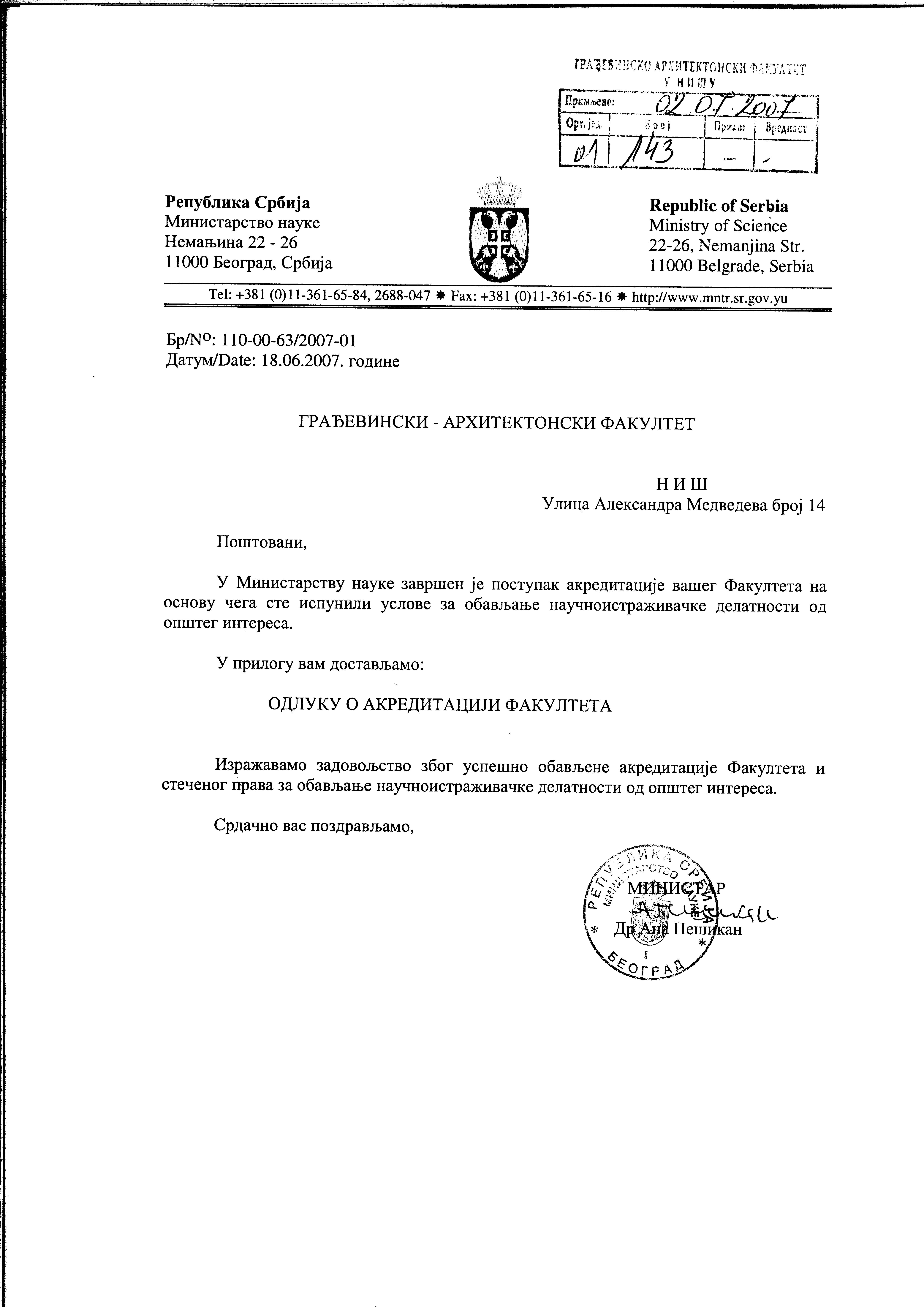 . / dc / Prilozi za Izvestaj o samovrednovanju GAF Nis 2025 / Prilog 1.6 Odlukeo akreditaciji NIO /